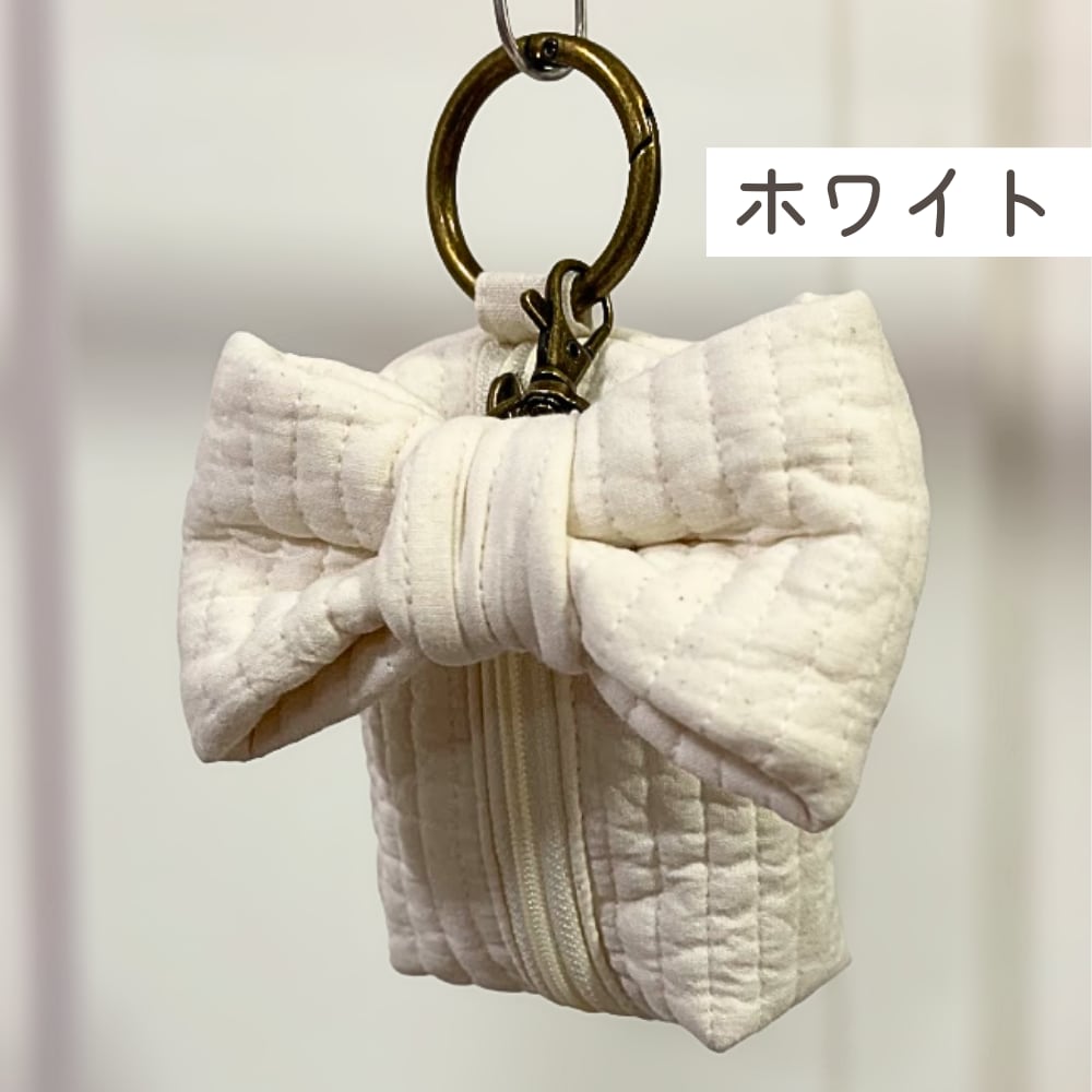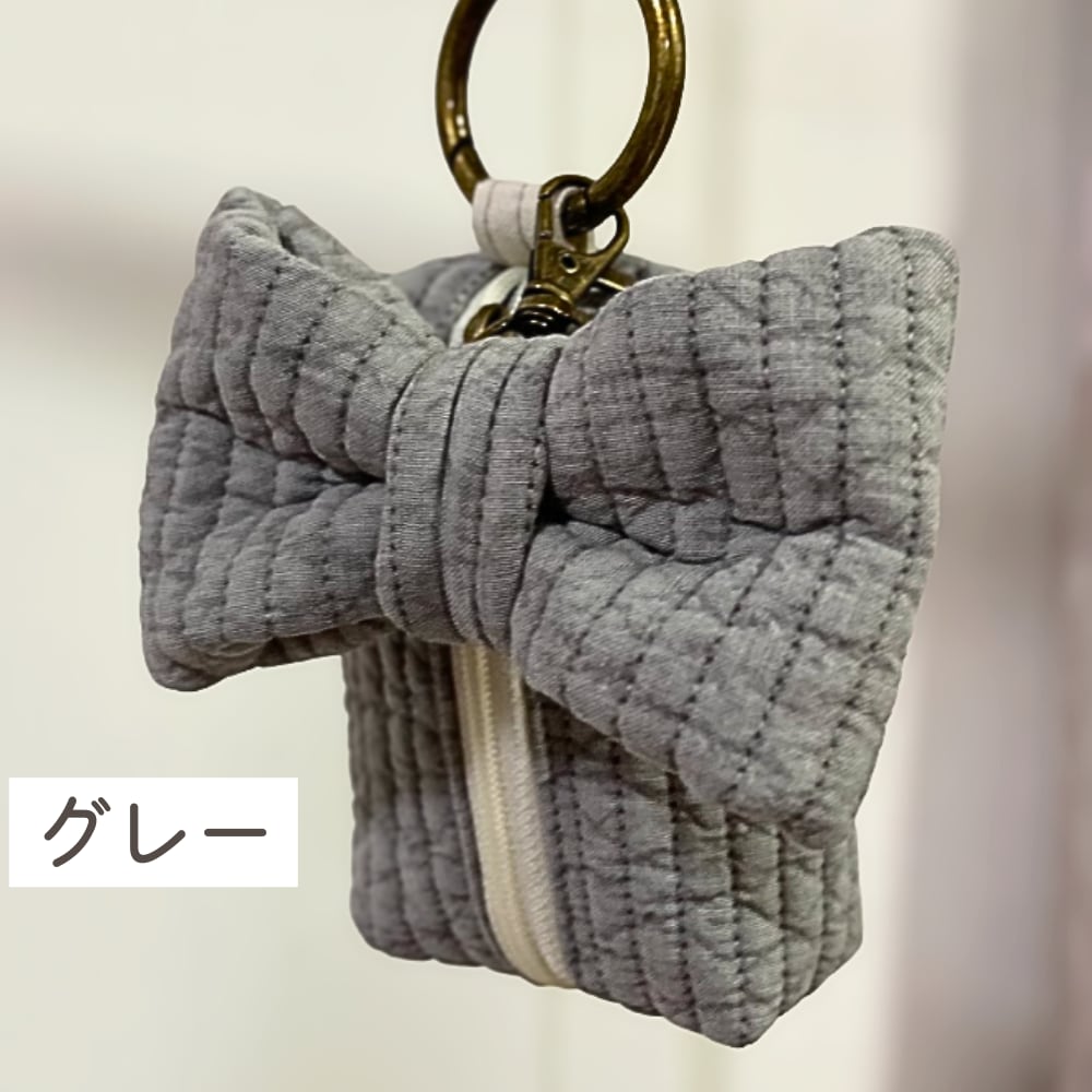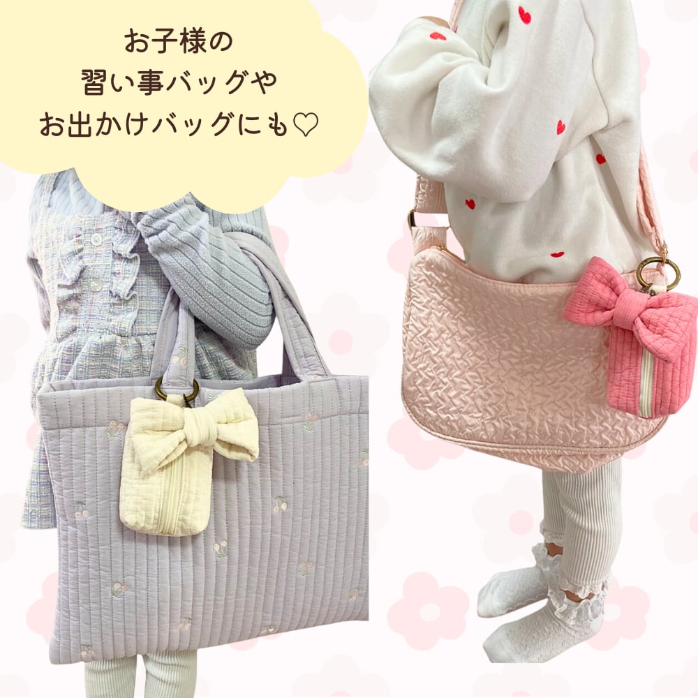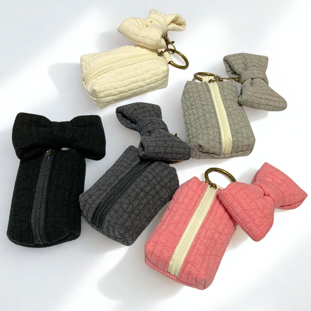 韓国で愛されるキルティング生地「ヌビ(イブル)」を使用した、ふんわり柔らかな手触りのミニポーチです。存在感たっぷりの大きなヌビリボンチャームがポイント。