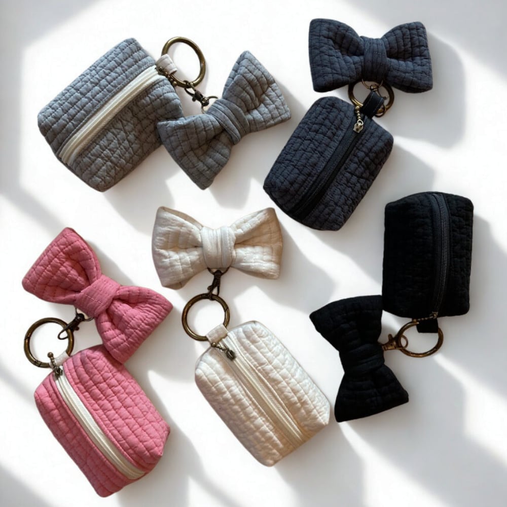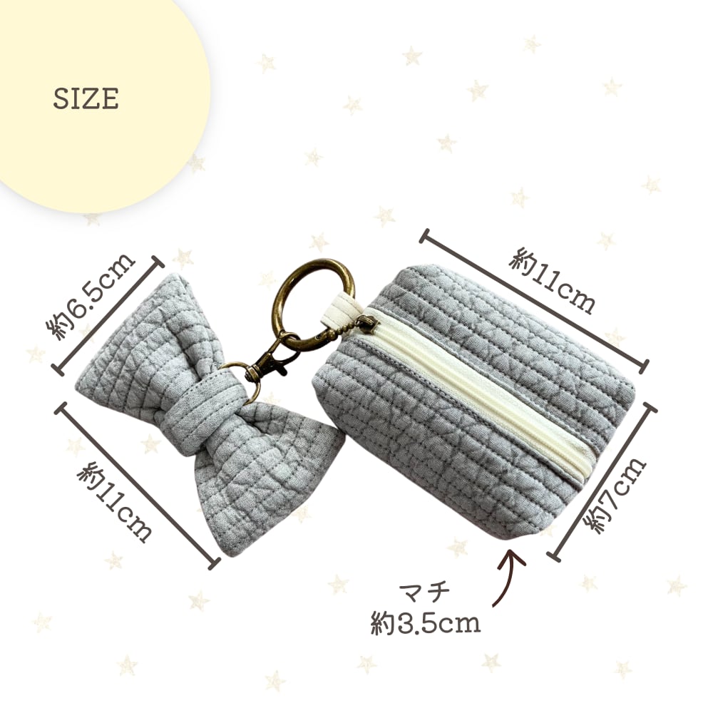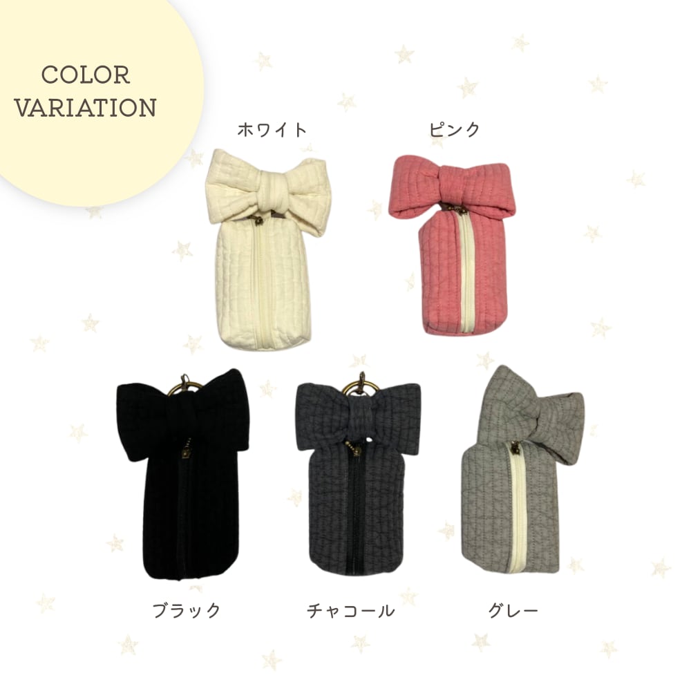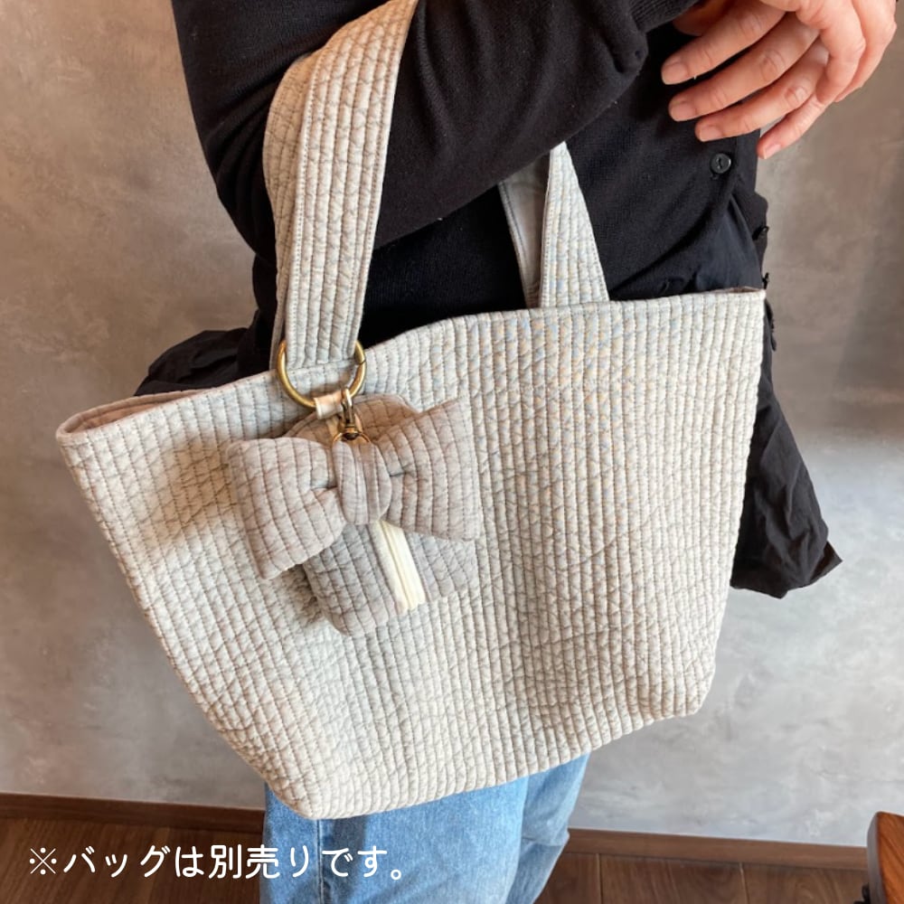 韓国で愛されるキルティング生地「ヌビ(イブル)」を使用した、ふんわり柔らかな手触りのミニポーチです。存在感たっぷりの大きなヌビリボンチャームがポイント。