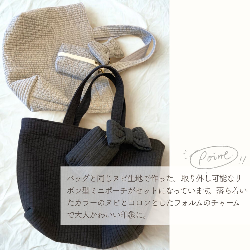 コロンとしたフォルムが可愛いリボンチャームとミニポーチ付きのヌビバックです。